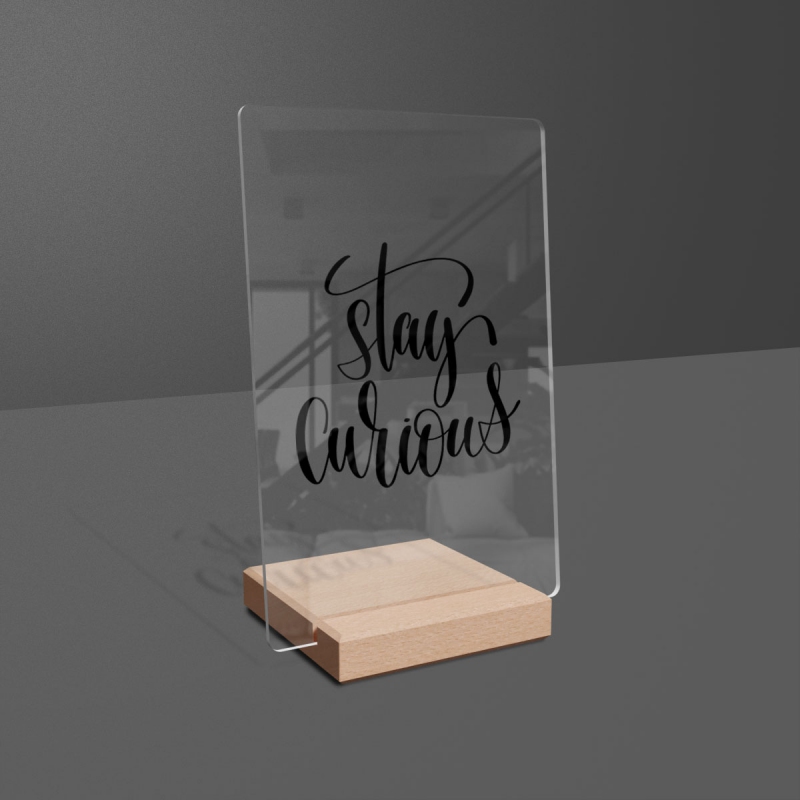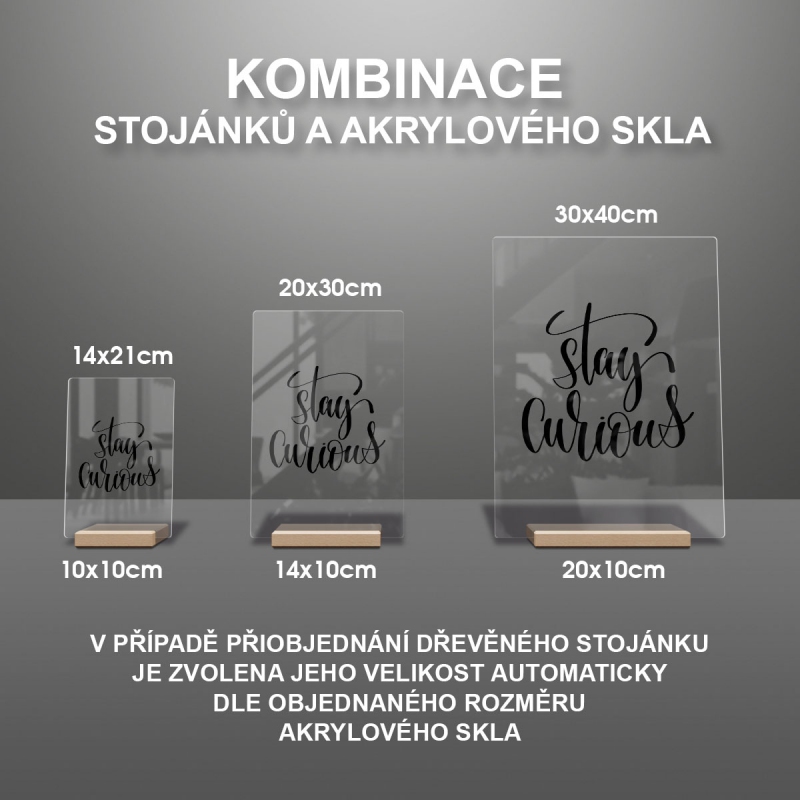 Na produktovém fotu vyobrazena nejoblíbenější varianta akrylového skla 14x21/21x14cm a dřevěný stojánek 10x10cm.