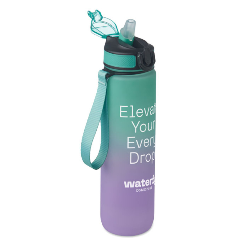 Sportovní RPET láhev na vodu s integrovaným brčkem, měkkým silikonovým náustkem, motivačním časovým značením, víčkem otevíratelným jednou rukou, bezpečnostním zámkem a popruhem na přenášení. Objem 1 l.