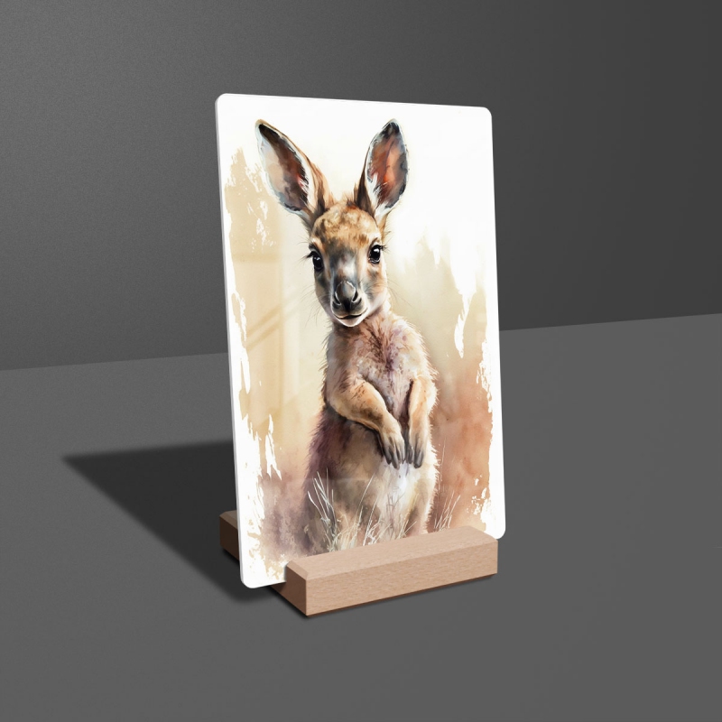Na produktovém fotu vyobrazena nejoblíbenější varianta akrylového skla 14x21/21x14cm a dřevěný stojánek 10x10cm.