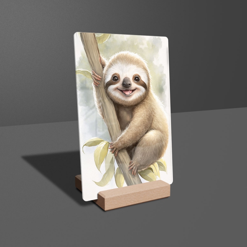 Na produktovém fotu vyobrazena nejoblíbenější varianta akrylového skla 14x21/21x14cm a dřevěný stojánek 10x10cm.