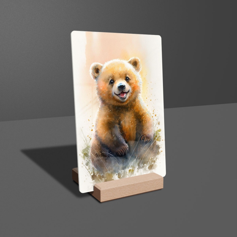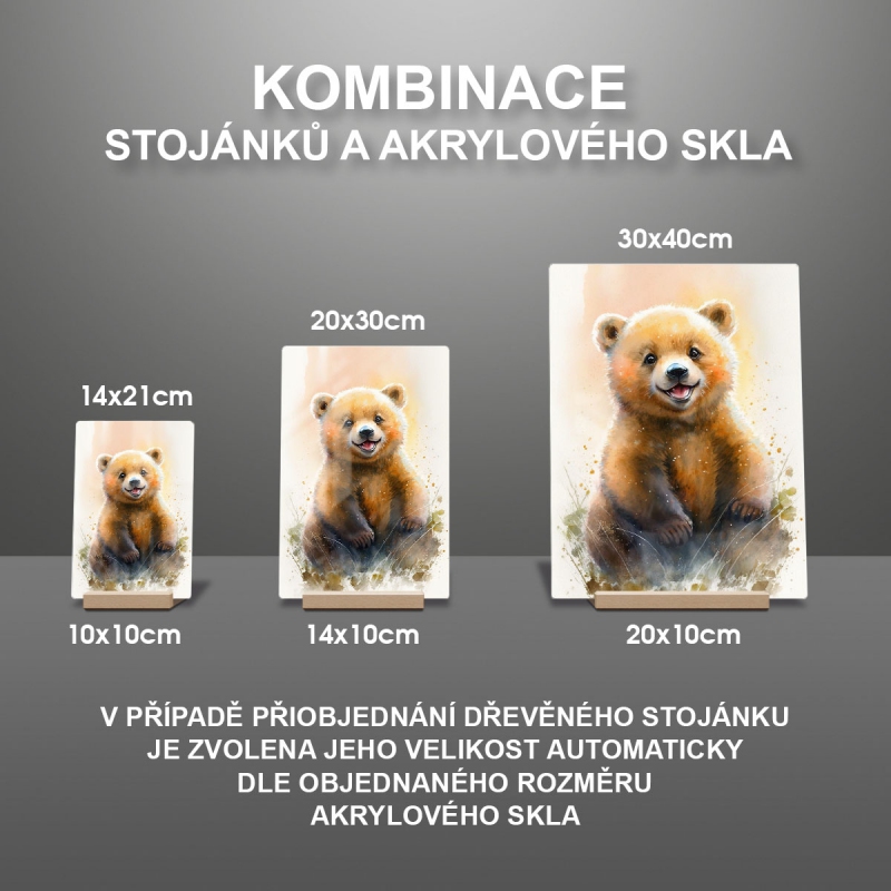 Na produktovém fotu vyobrazena nejoblíbenější varianta akrylového skla 14x21/21x14cm a dřevěný stojánek 10x10cm.