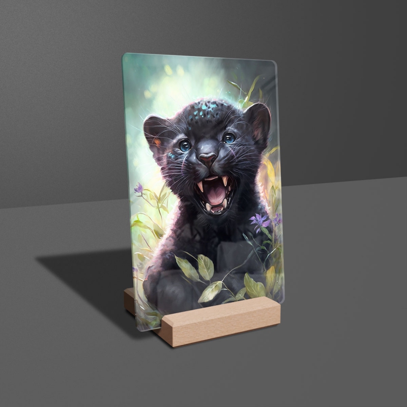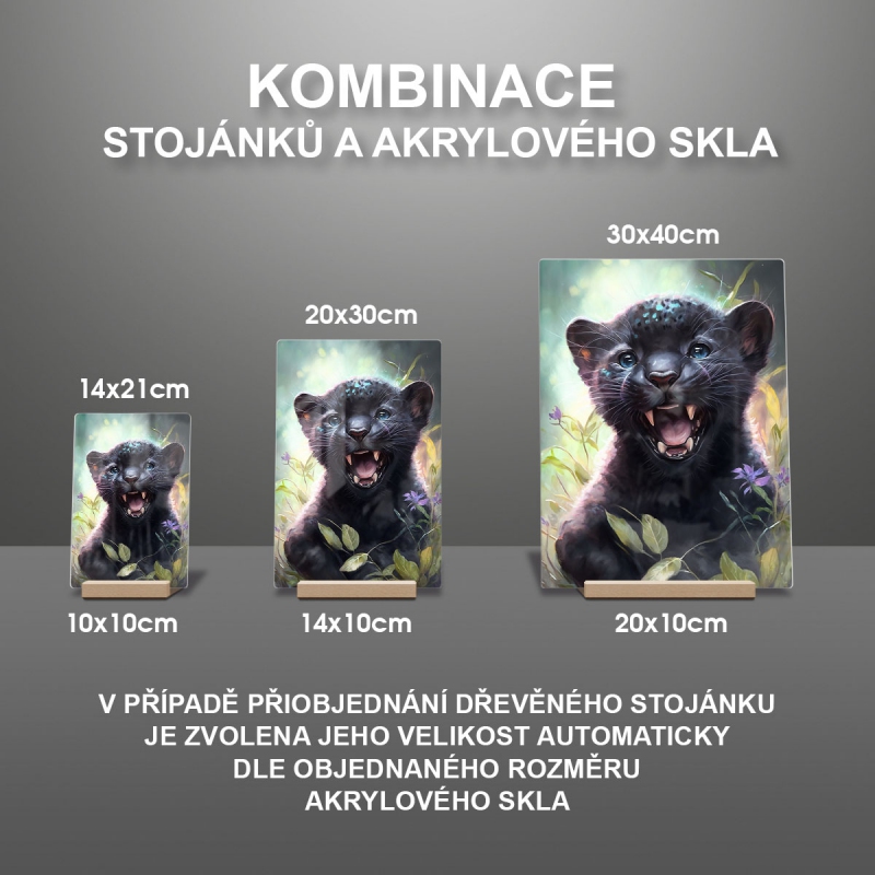 Na produktovém fotu vyobrazena nejoblíbenější varianta akrylového skla 14x21/21x14cm a dřevěný stojánek 10x10cm.