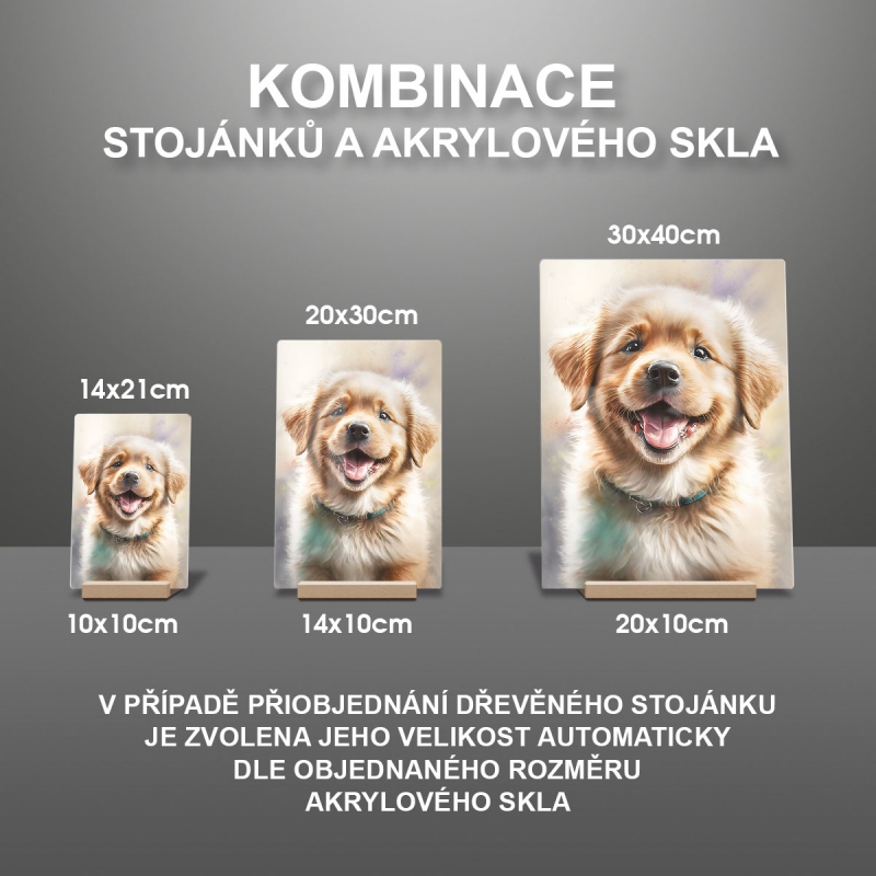 Na produktovém fotu vyobrazena nejoblíbenější varianta akrylového skla 14x21/21x14cm a dřevěný stojánek 10x10cm.