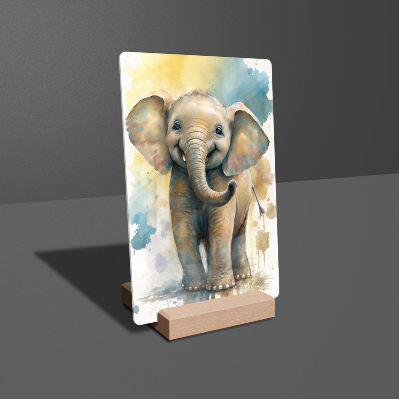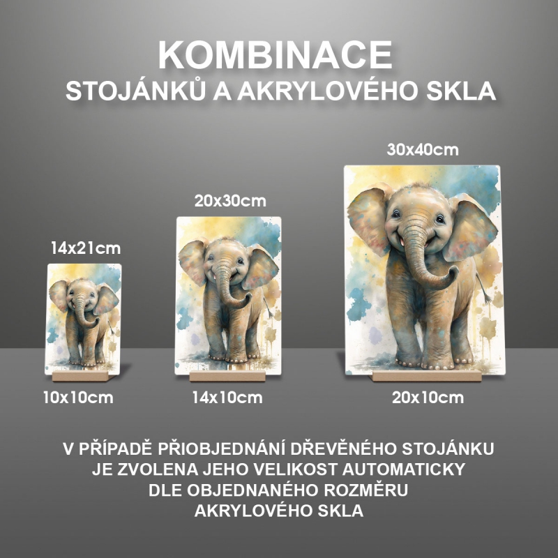 Na produktovém fotu vyobrazena nejoblíbenější varianta akrylového skla 14x21/21x14cm a dřevěný stojánek 10x10cm.