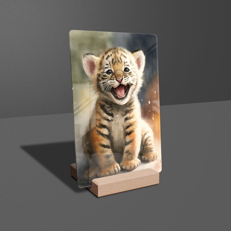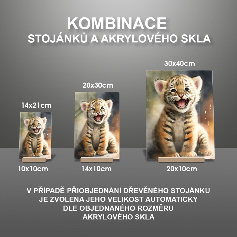 Na produktovém fotu vyobrazena nejoblíbenější varianta akrylového skla 14x21/21x14cm a dřevěný stojánek 10x10cm.