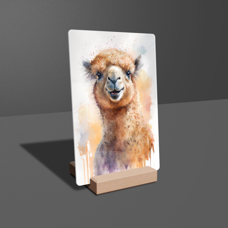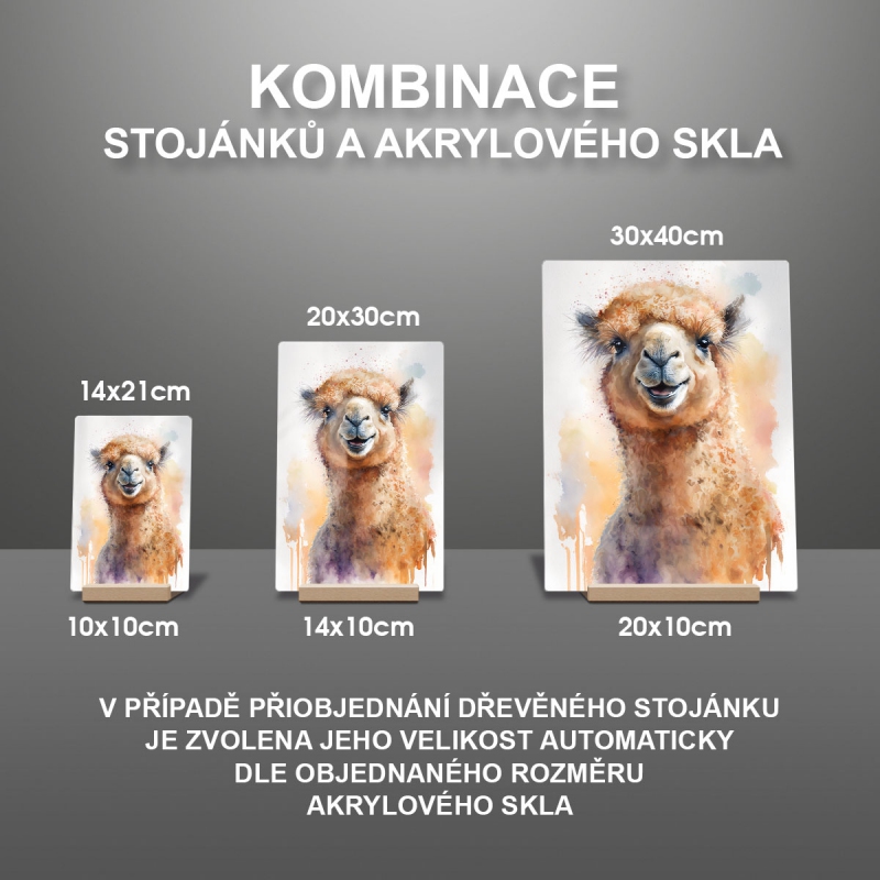 Na produktovém fotu vyobrazena nejoblíbenější varianta akrylového skla 14x21/21x14cm a dřevěný stojánek 10x10cm.