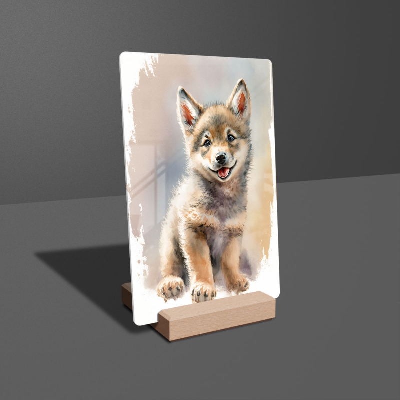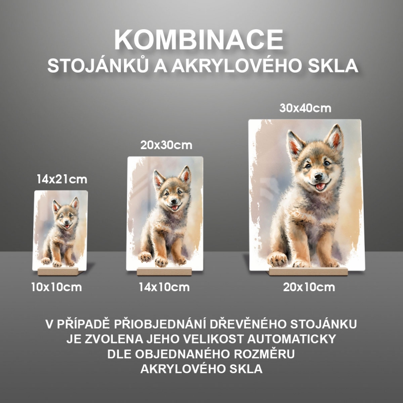Na produktovém fotu vyobrazena nejoblíbenější varianta akrylového skla 14x21/21x14cm a dřevěný stojánek 10x10cm.