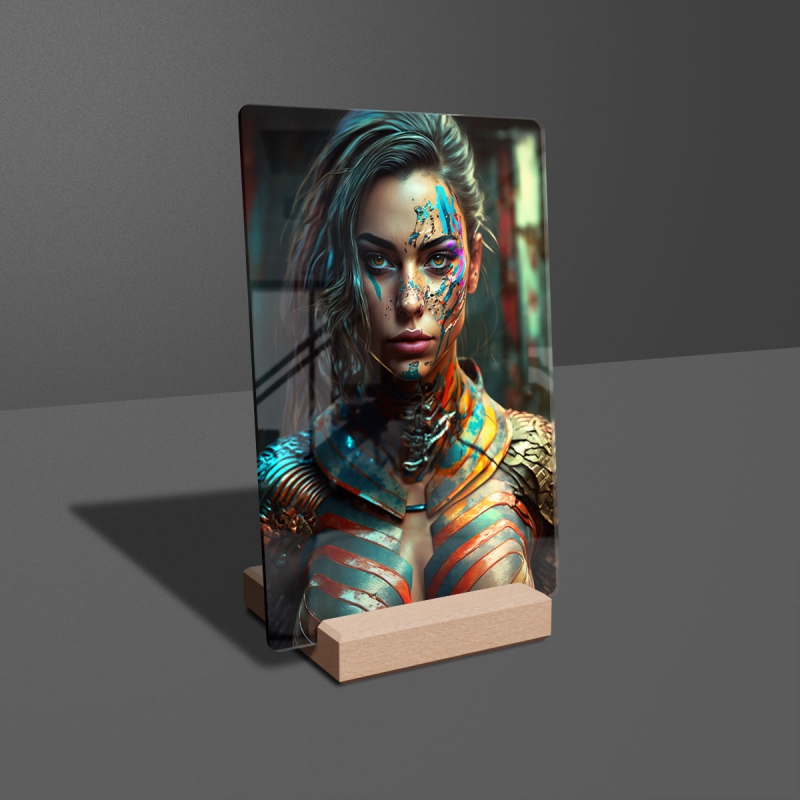 Na produktovém fotu vyobrazena nejoblíbenější varianta akrylového skla 14x21/21x14cm a dřevěný stojánek 10x10cm.