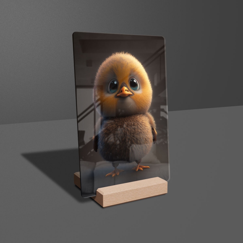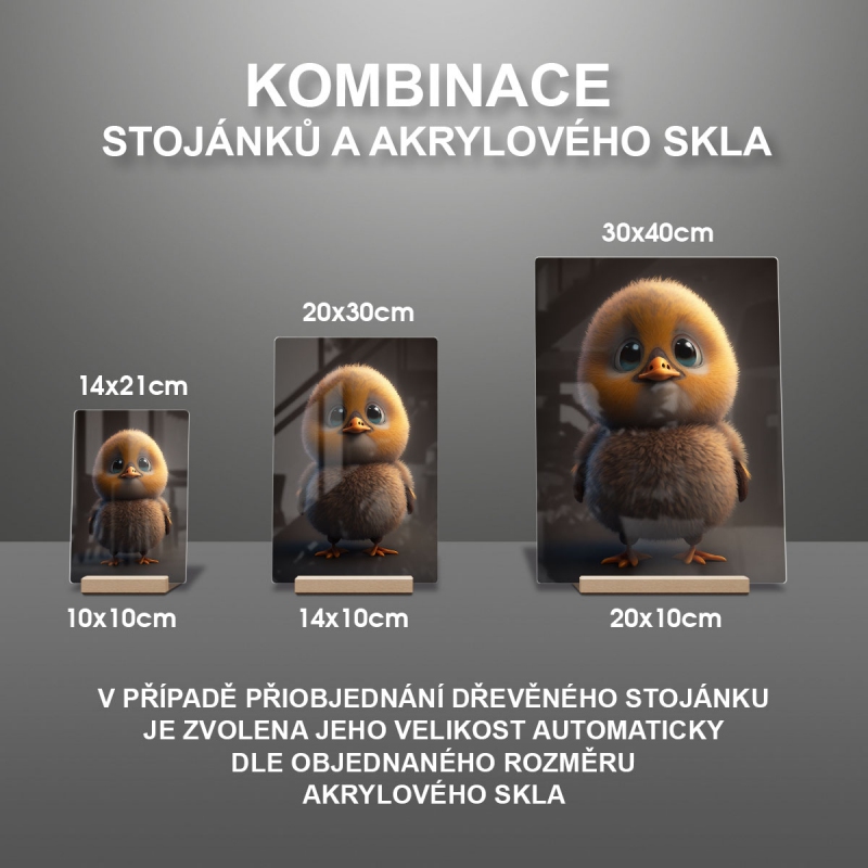 Na produktovém fotu vyobrazena nejoblíbenější varianta akrylového skla 14x21/21x14cm a dřevěný stojánek 10x10cm.