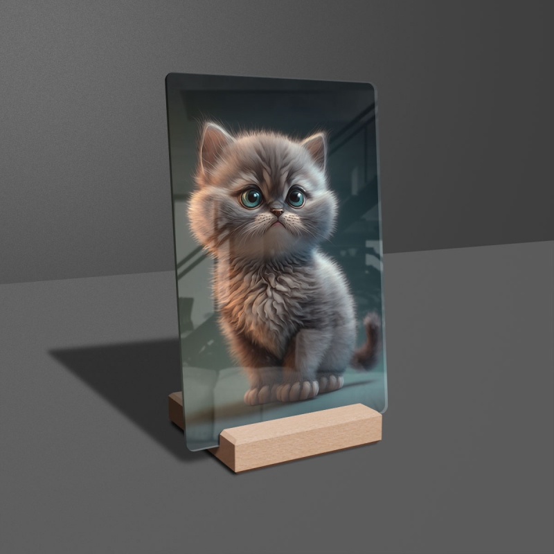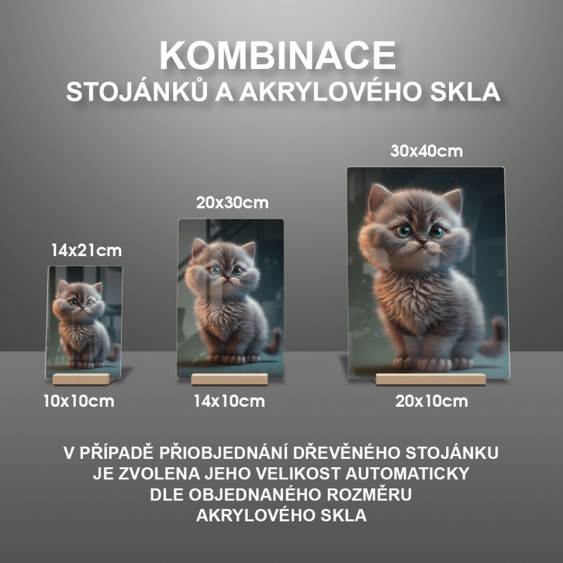 Na produktovém fotu vyobrazena nejoblíbenější varianta akrylového skla 14x21/21x14cm a dřevěný stojánek 10x10cm.
