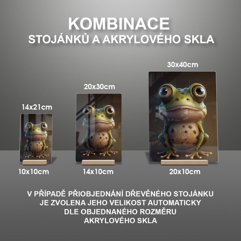 Na produktovém fotu vyobrazena nejoblíbenější varianta akrylového skla 14x21/21x14cm a dřevěný stojánek 10x10cm.
