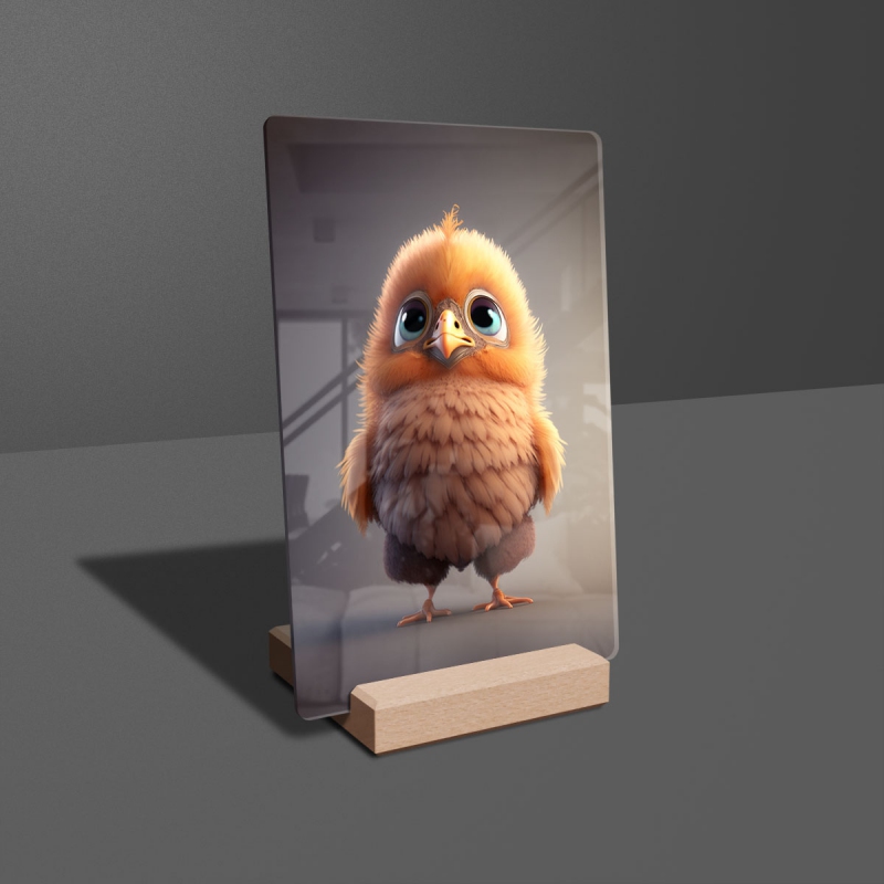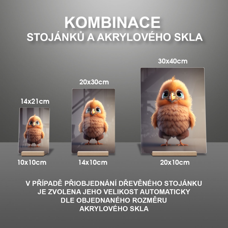 Na produktovém fotu vyobrazena nejoblíbenější varianta akrylového skla 14x21/21x14cm a dřevěný stojánek 10x10cm.