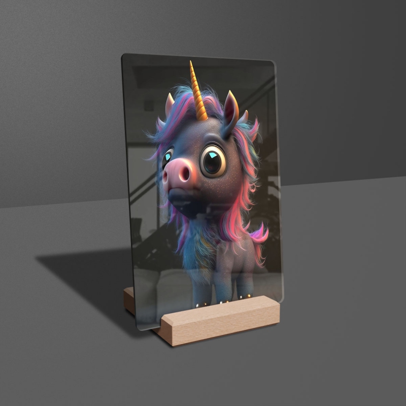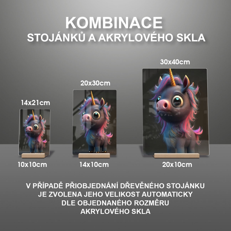Na produktovém fotu vyobrazena nejoblíbenější varianta akrylového skla 14x21/21x14cm a dřevěný stojánek 10x10cm.