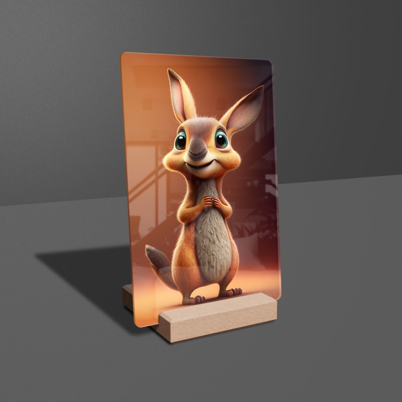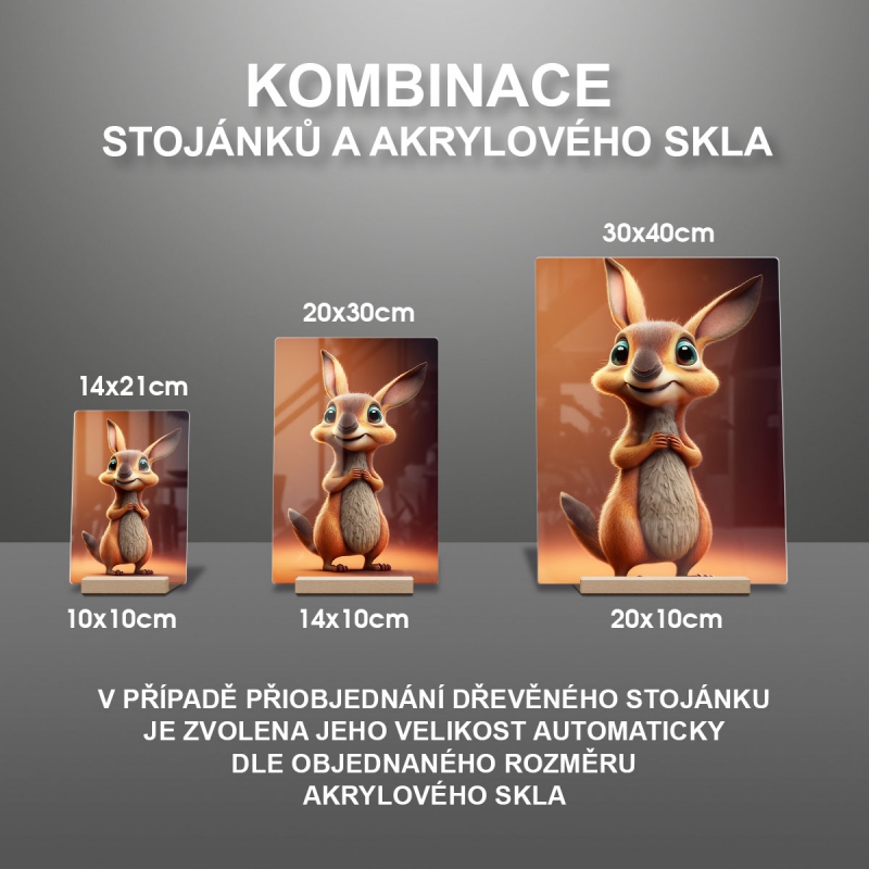 Na produktovém fotu vyobrazena nejoblíbenější varianta akrylového skla 14x21/21x14cm a dřevěný stojánek 10x10cm.