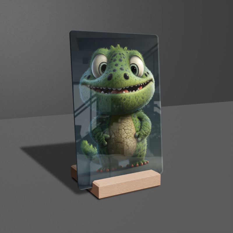 Na produktovém fotu vyobrazena nejoblíbenější varianta akrylového skla 14x21/21x14cm a dřevěný stojánek 10x10cm.
