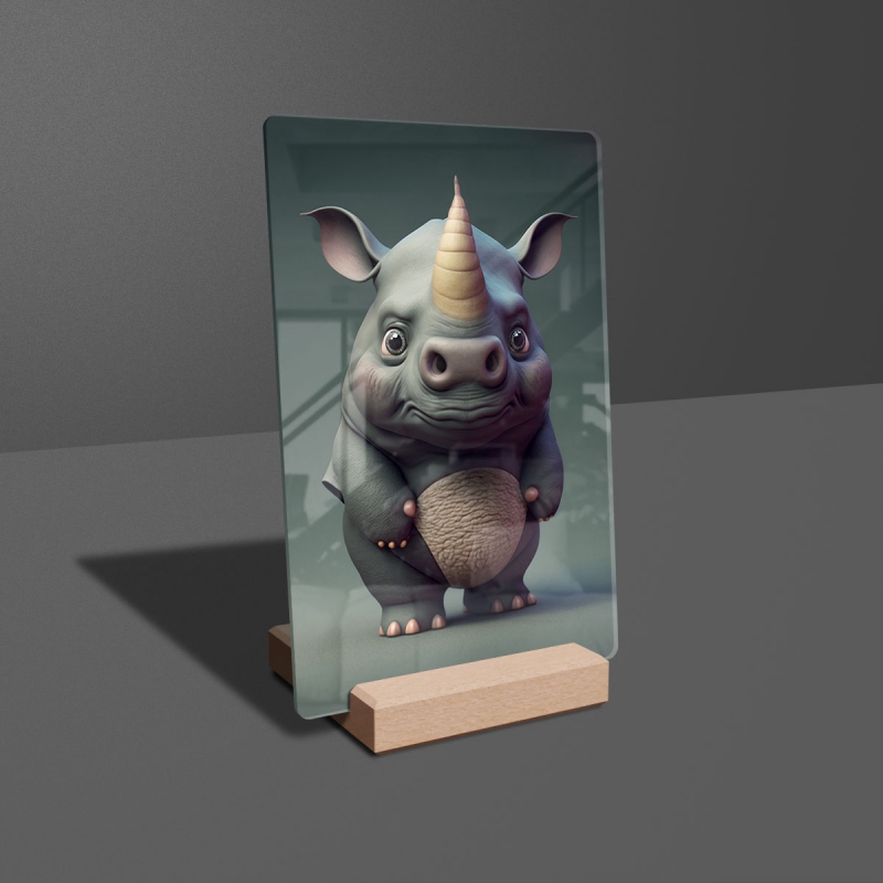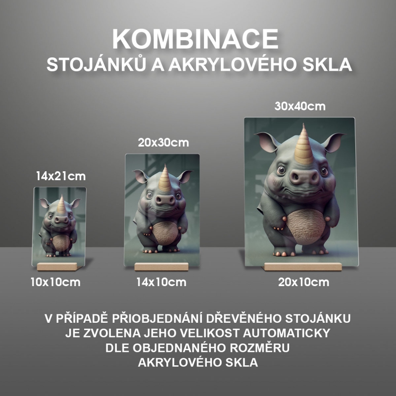 Na produktovém fotu vyobrazena nejoblíbenější varianta akrylového skla 14x21/21x14cm a dřevěný stojánek 10x10cm.