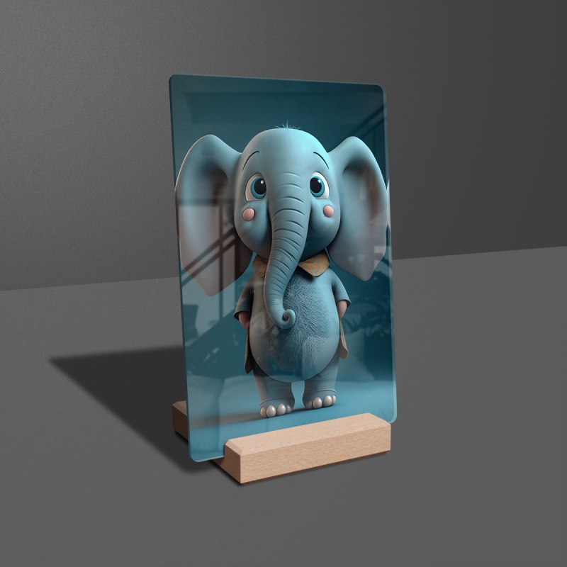 Na produktovém fotu vyobrazena nejoblíbenější varianta akrylového skla 14x21/21x14cm a dřevěný stojánek 10x10cm.