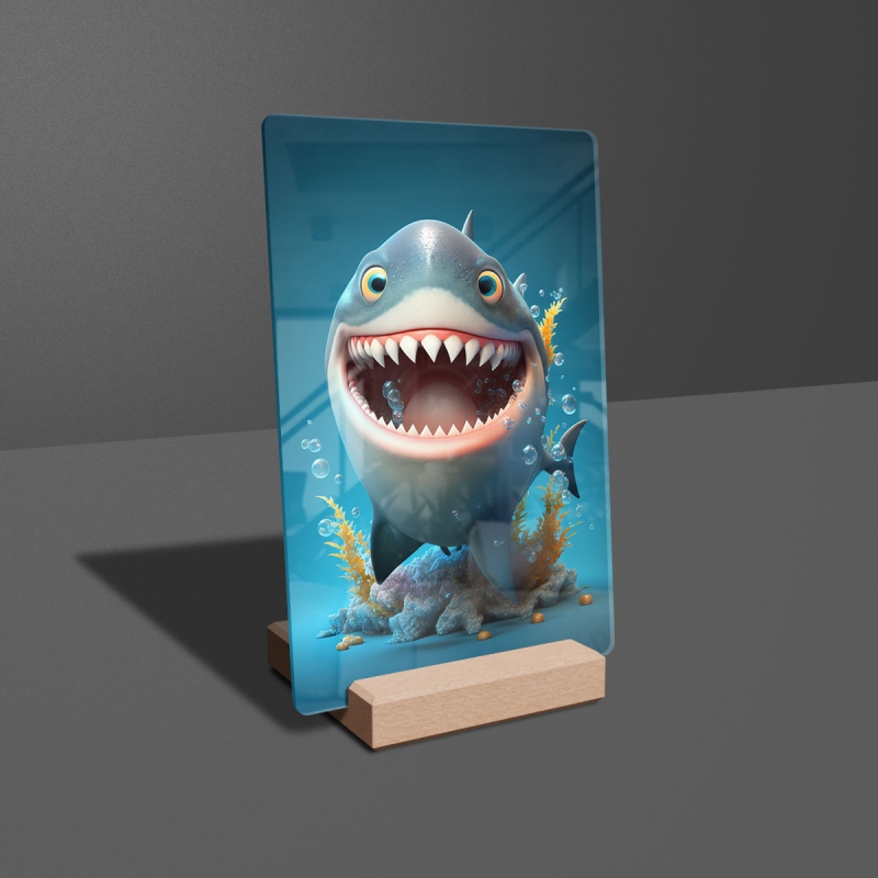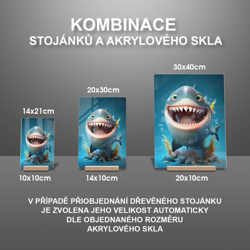Na produktovém fotu vyobrazena nejoblíbenější varianta akrylového skla 14x21/21x14cm a dřevěný stojánek 10x10cm.