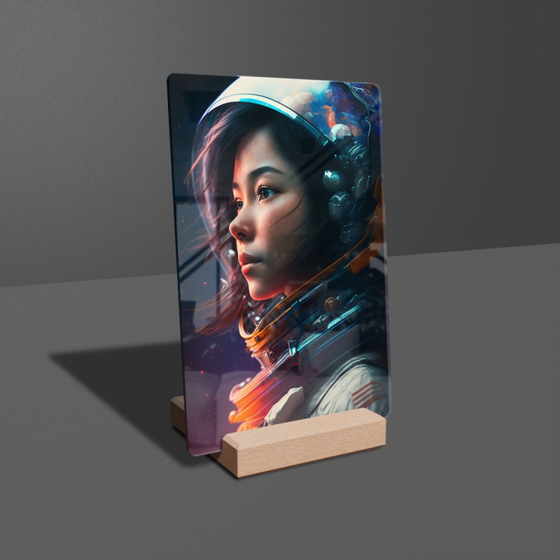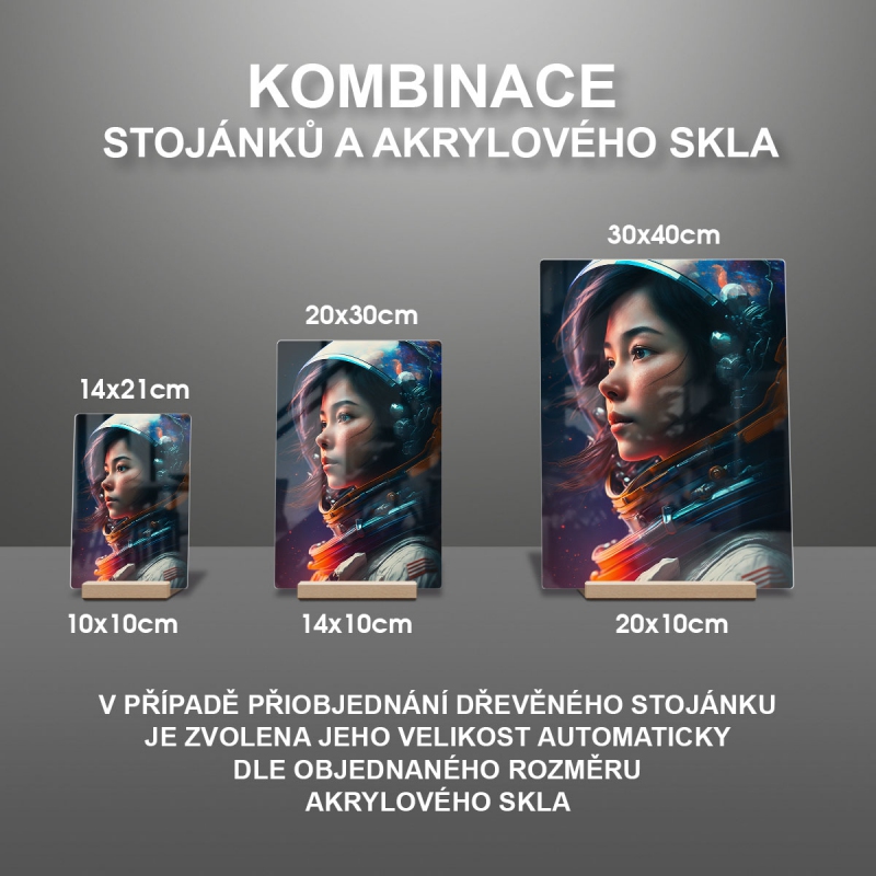 Na produktovém fotu vyobrazena nejoblíbenější varianta akrylového skla 14x21/21x14cm a dřevěný stojánek 10x10cm.