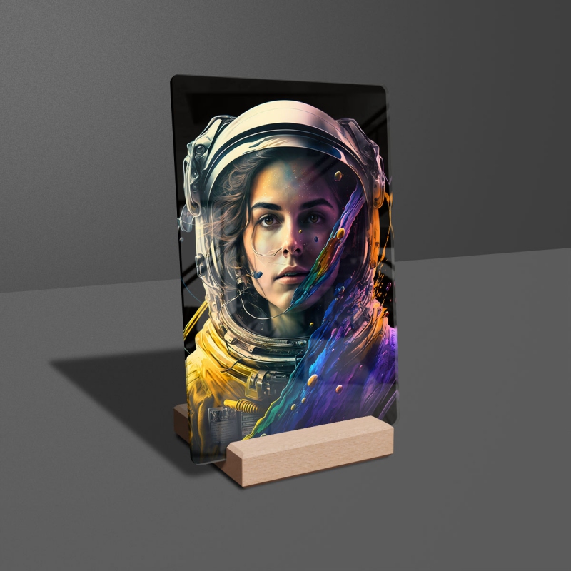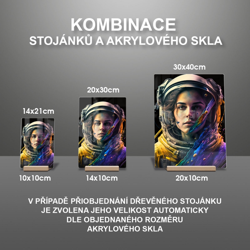 Na produktovém fotu vyobrazena nejoblíbenější varianta akrylového skla 14x21/21x14cm a dřevěný stojánek 10x10cm.