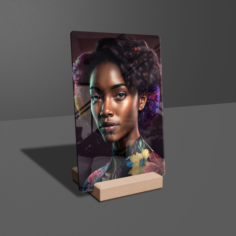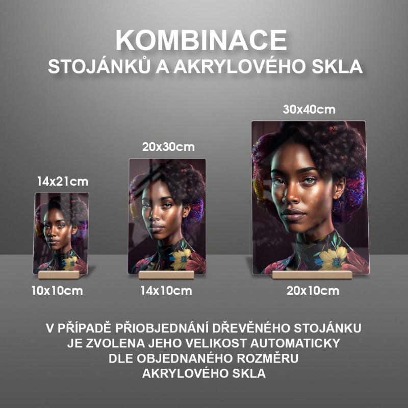 Na produktovém fotu vyobrazena nejoblíbenější varianta akrylového skla 14x21/21x14cm a dřevěný stojánek 10x10cm.