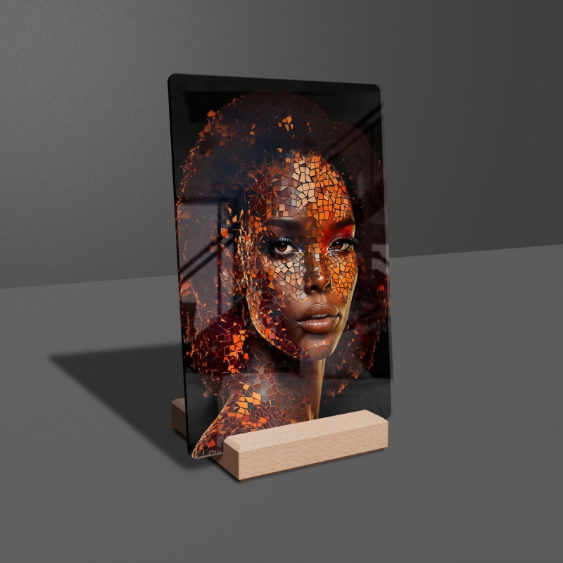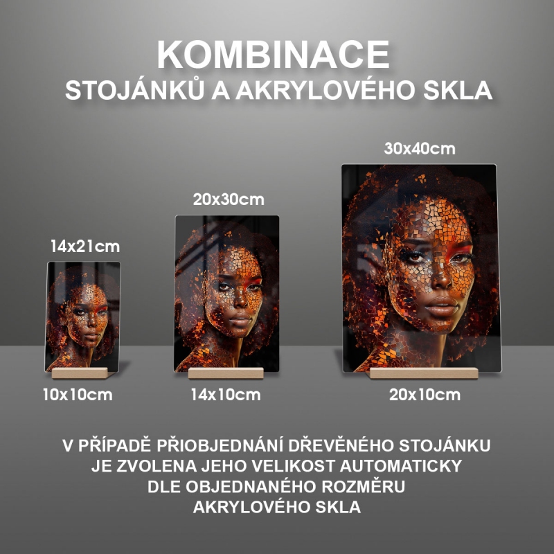 Na produktovém fotu vyobrazena nejoblíbenější varianta akrylového skla 14x21/21x14cm a dřevěný stojánek 10x10cm.