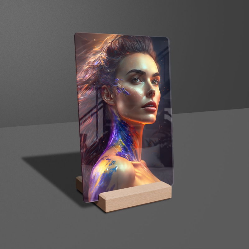 Na produktovém fotu vyobrazena nejoblíbenější varianta akrylového skla 14x21/21x14cm a dřevěný stojánek 10x10cm.
