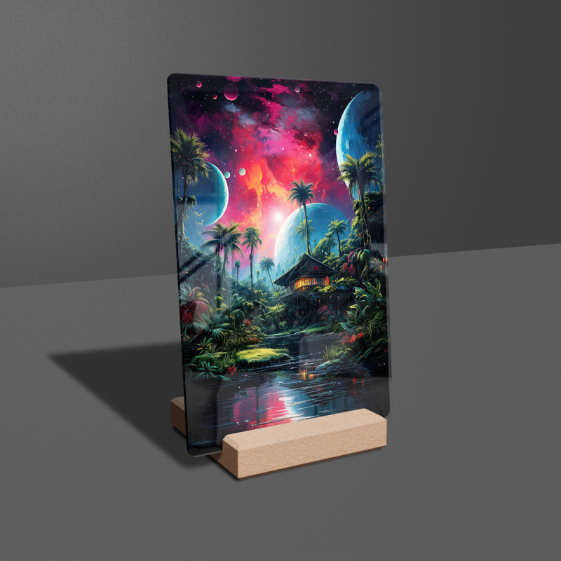 Akrylové sklo barevná malba domu z džungle a planet nad ním