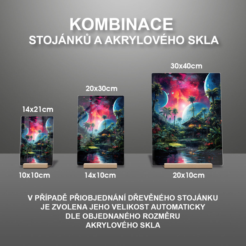 Na produktovém fotu vyobrazena nejoblíbenější varianta akrylového skla 14x21/21x14cm a dřevěný stojánek 10x10cm.