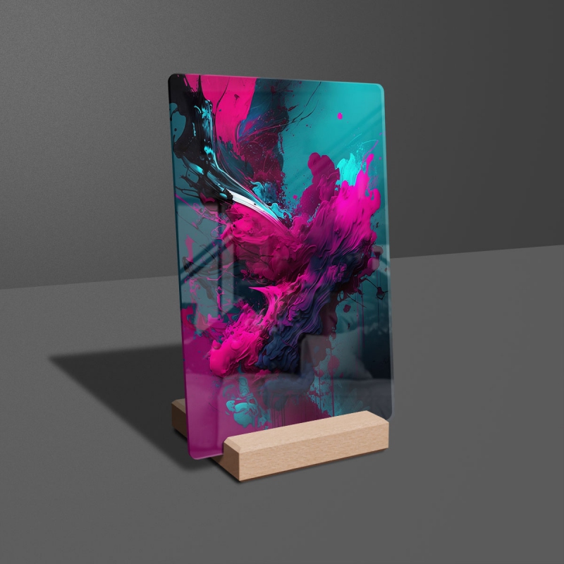 Na produktovém fotu vyobrazena nejoblíbenější varianta akrylového skla 14x21/21x14cm a dřevěný stojánek 10x10cm.
