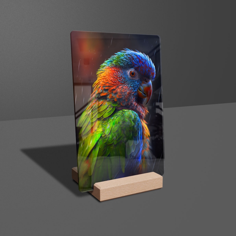 Na produktovém fotu vyobrazena nejoblíbenější varianta akrylového skla 14x21/21x14cm a dřevěný stojánek 10x10cm.