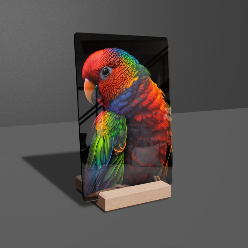 Na produktovém fotu vyobrazena nejoblíbenější varianta akrylového skla 14x21/21x14cm a dřevěný stojánek 10x10cm.