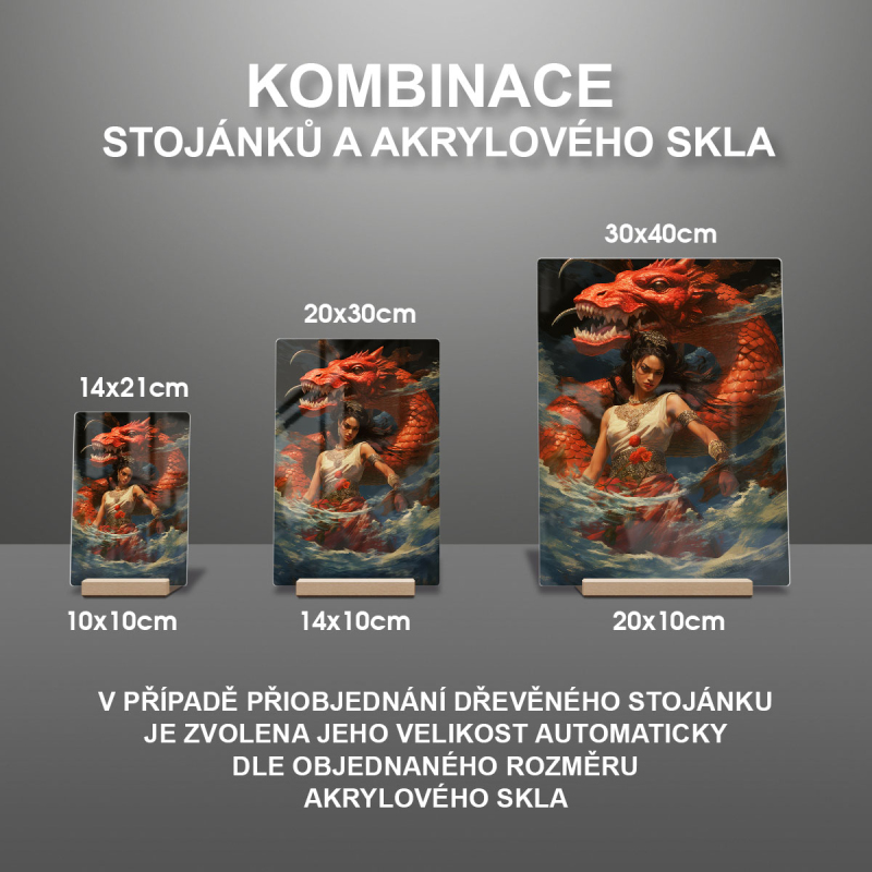Na produktovém fotu vyobrazena nejoblíbenější varianta akrylového skla 14x21/21x14cm a dřevěný stojánek 10x10cm.