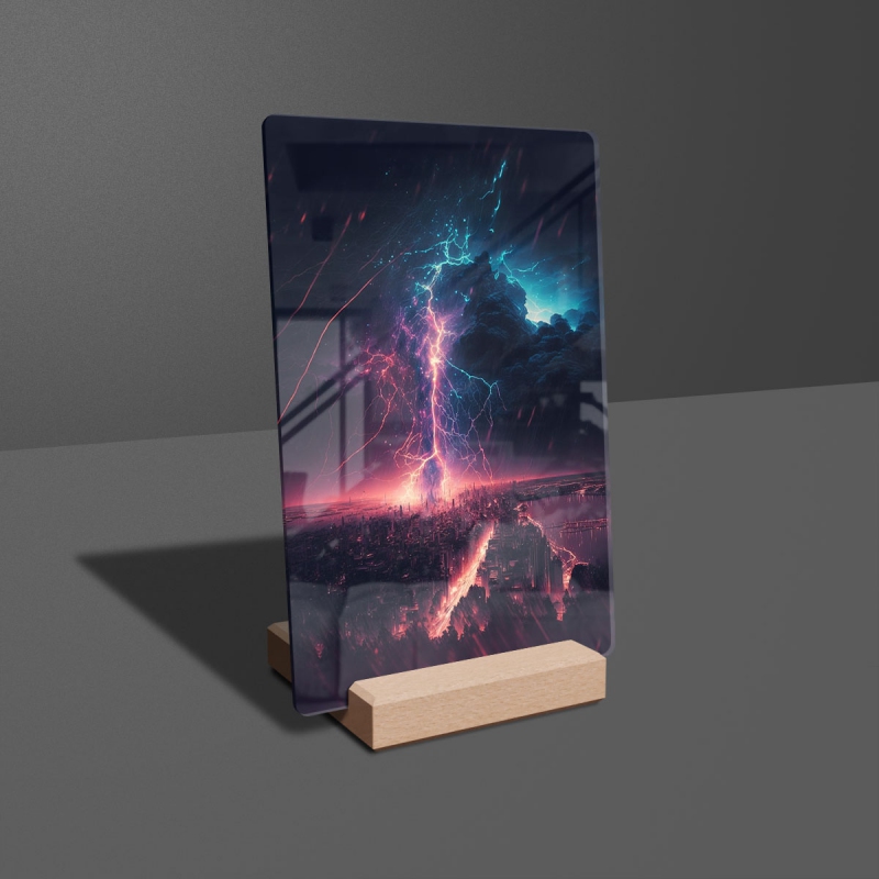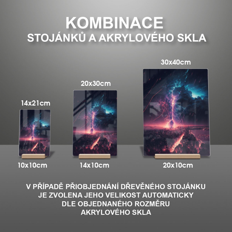 Na produktovém fotu vyobrazena nejoblíbenější varianta akrylového skla 14x21/21x14cm a dřevěný stojánek 10x10cm.