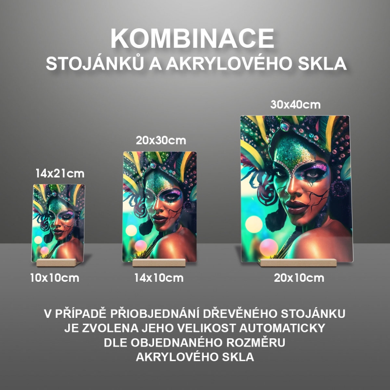 Na produktovém fotu vyobrazena nejoblíbenější varianta akrylového skla 14x21/21x14cm a dřevěný stojánek 10x10cm.