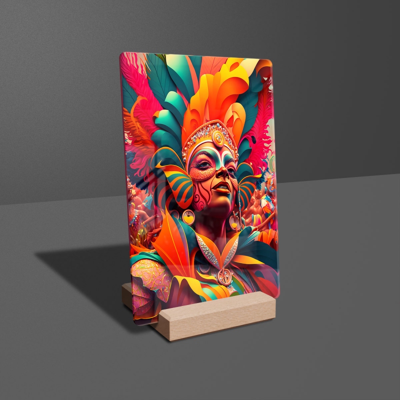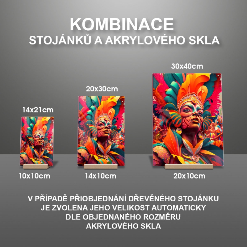 Na produktovém fotu vyobrazena nejoblíbenější varianta akrylového skla 14x21/21x14cm a dřevěný stojánek 10x10cm.