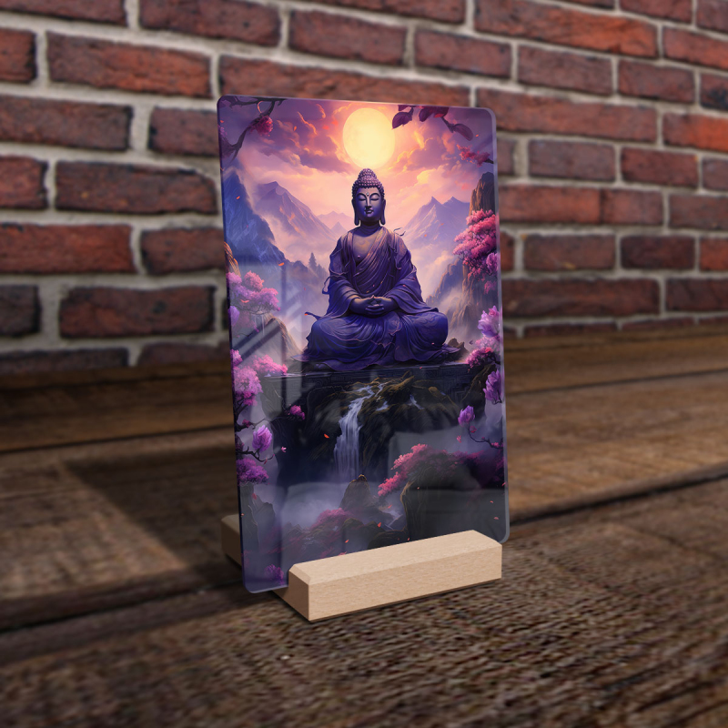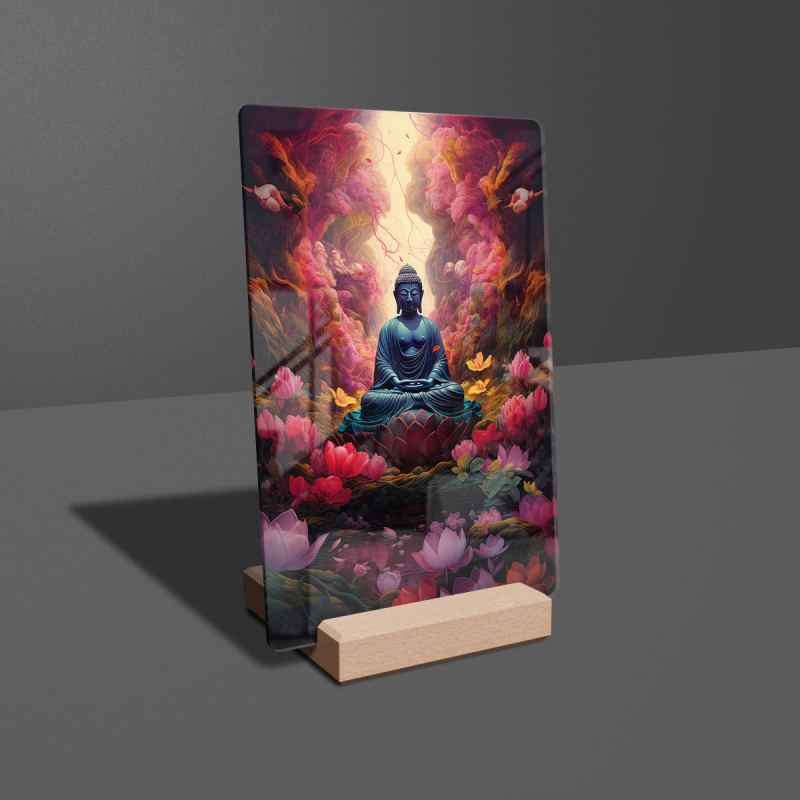 Na produktovém fotu vyobrazena nejoblíbenější varianta akrylového skla 14x21/21x14cm a dřevěný stojánek 10x10cm.