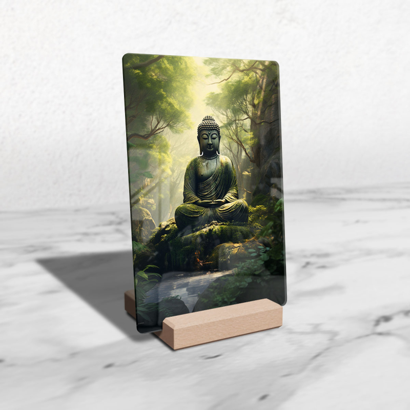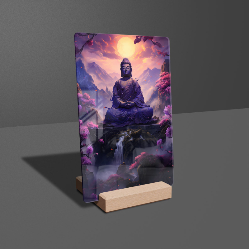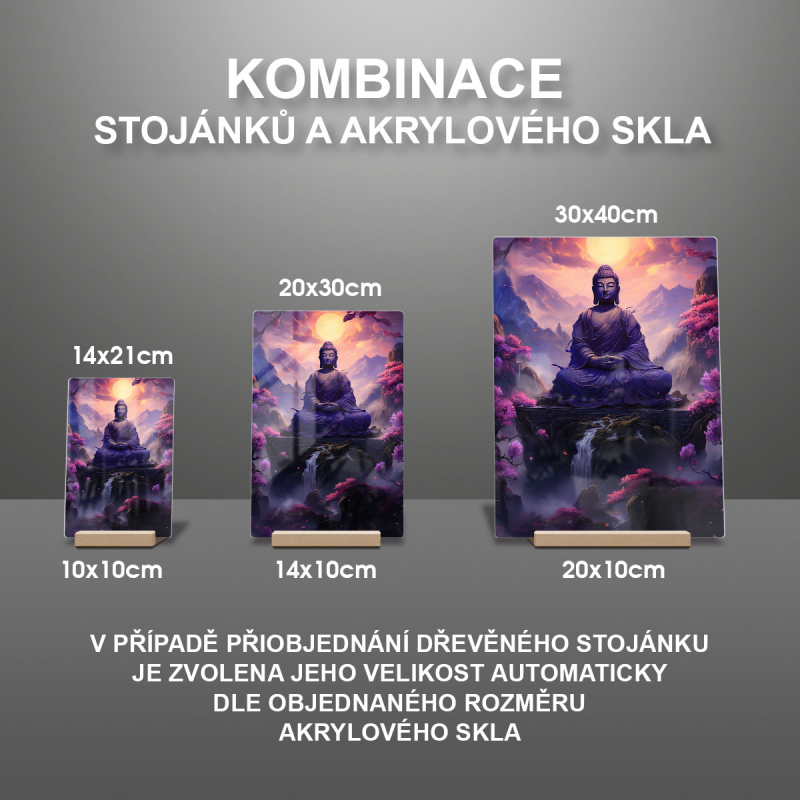 Na produktovém fotu vyobrazena nejoblíbenější varianta akrylového skla 14x21/21x14cm a dřevěný stojánek 10x10cm.