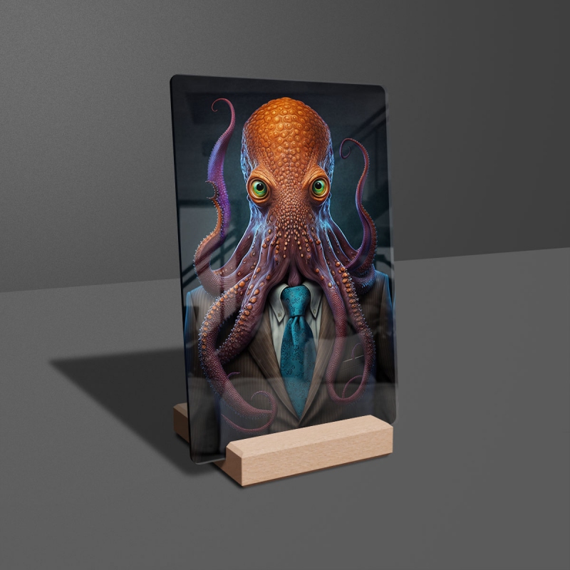 Na produktovém fotu vyobrazena nejoblíbenější varianta akrylového skla 14x21/21x14cm a dřevěný stojánek 10x10cm.