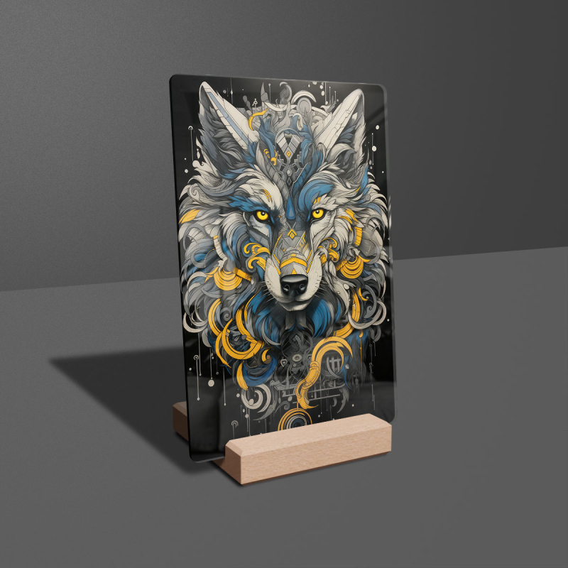 Na produktovém fotu vyobrazena nejoblíbenější varianta akrylového skla 14x21/21x14cm a dřevěný stojánek 10x10cm.