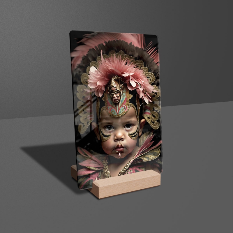 Na produktovém fotu vyobrazena nejoblíbenější varianta akrylového skla 14x21/21x14cm a dřevěný stojánek 10x10cm.
