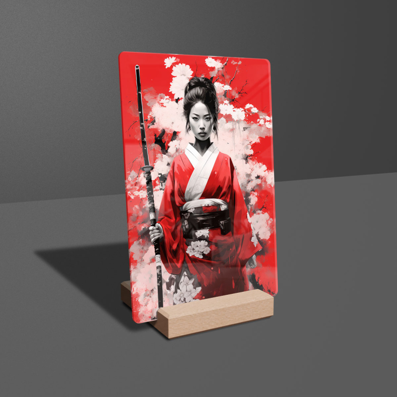 Na produktovém fotu vyobrazena nejoblíbenější varianta akrylového skla 14x21/21x14cm a dřevěný stojánek 10x10cm.