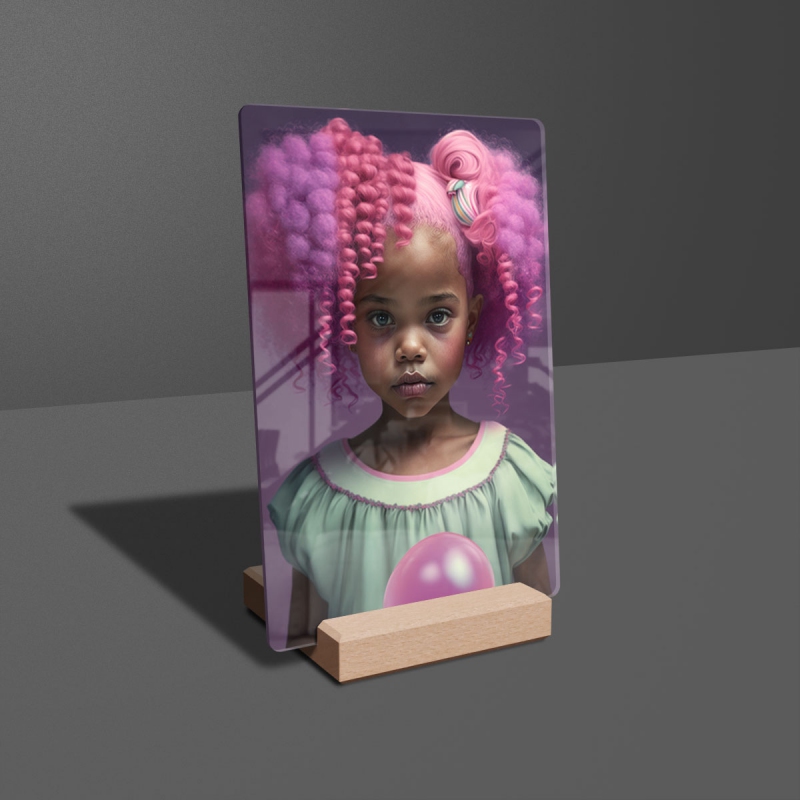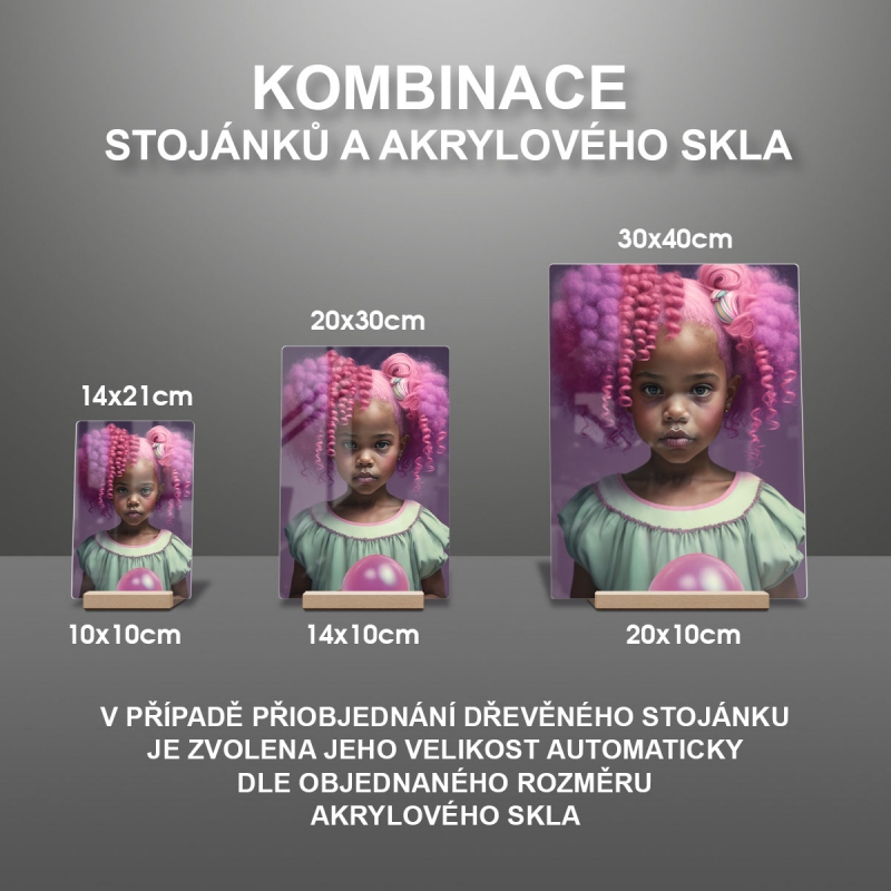 Na produktovém fotu vyobrazena nejoblíbenější varianta akrylového skla 14x21/21x14cm a dřevěný stojánek 10x10cm.