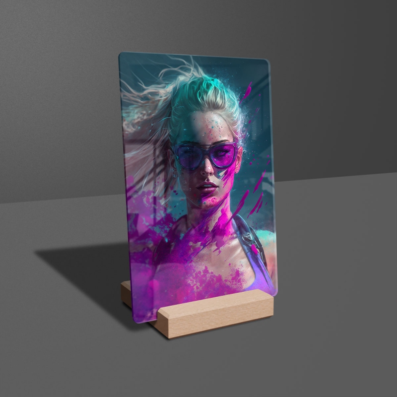 Na produktovém fotu vyobrazena nejoblíbenější varianta akrylového skla 14x21/21x14cm a dřevěný stojánek 10x10cm.