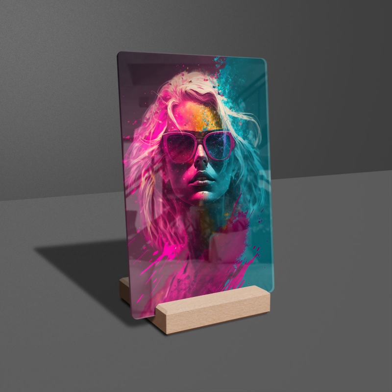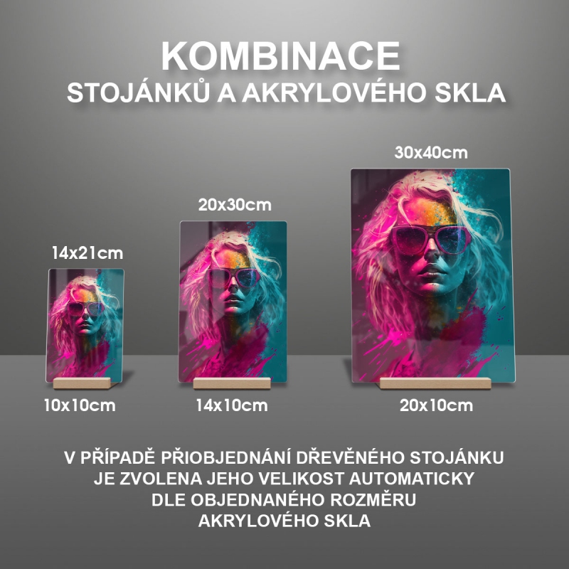 Na produktovém fotu vyobrazena nejoblíbenější varianta akrylového skla 14x21/21x14cm a dřevěný stojánek 10x10cm.