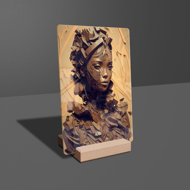 Na produktovém fotu vyobrazena nejoblíbenější varianta akrylového skla 14x21/21x14cm a dřevěný stojánek 10x10cm.