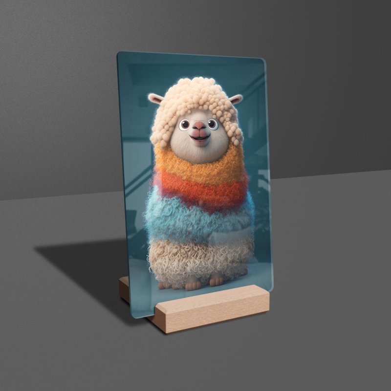 Na produktovém fotu vyobrazena nejoblíbenější varianta akrylového skla 14x21/21x14cm a dřevěný stojánek 10x10cm.