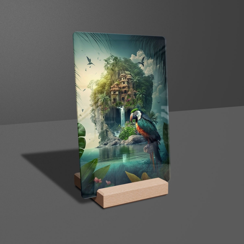 Na produktovém fotu vyobrazena nejoblíbenější varianta akrylového skla 14x21/21x14cm a dřevěný stojánek 10x10cm.