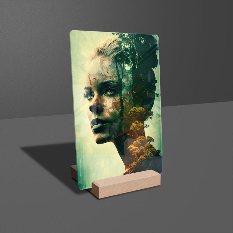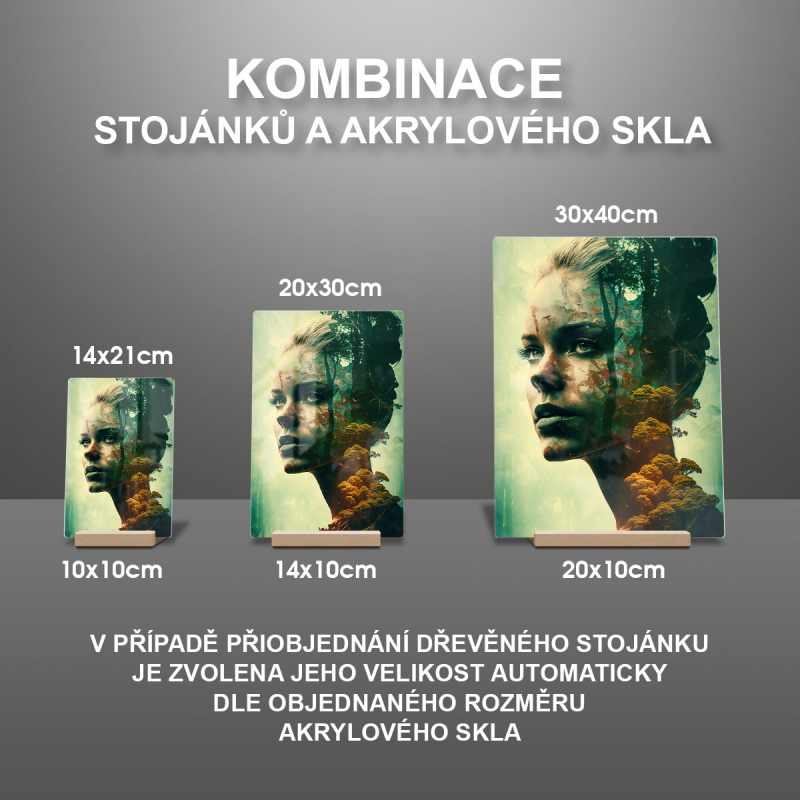 Na produktovém fotu vyobrazena nejoblíbenější varianta akrylového skla 14x21/21x14cm a dřevěný stojánek 10x10cm.