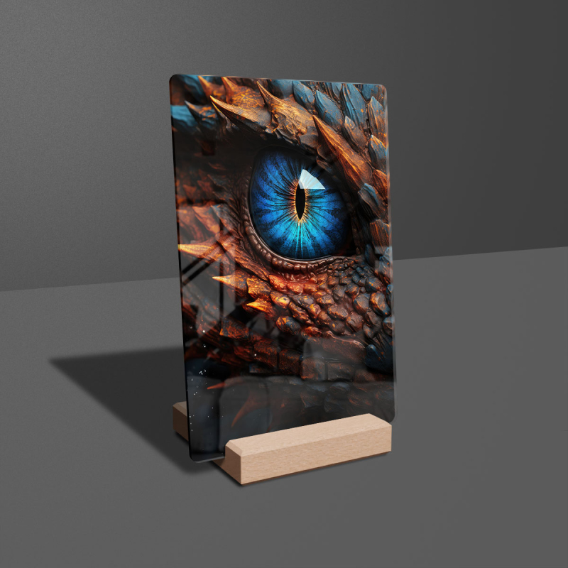 Na produktovém fotu vyobrazena nejoblíbenější varianta akrylového skla 14x21/21x14cm a dřevěný stojánek 10x10cm.
